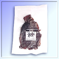 | ふかジャーキー モウカザメの身をスライスし天日干しにした後、自家製ダレに漬け、山桜のチップでスモークしました。濃縮海水塩を使用しています。 |